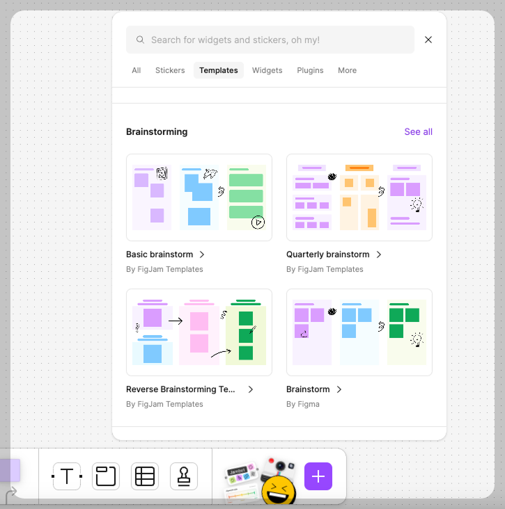 브레인스토밍을 할 때 가장 어려운 점 중 하나는 어떤 방식으로 아이디어를 정리해야 하는지 막막할 때가 많다는 점이에요. 무작정 생각나는 대로 적다 보면 아이디어가 중구난방으로 흩어지고, 논의가 산만해질 수 있어요. FigJam에서는 이런 문제를 해결하기 위해 다양한 브레인스토밍 템플릿을 제공해요.