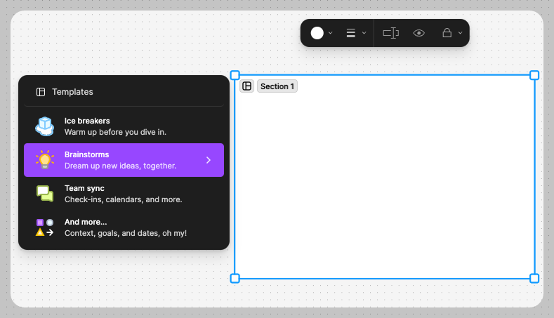 이 템플릿들을 활용하면 처음부터 구조를 고민할 필요 없이, 체계적으로 브레인스토밍을 진행할 수 있어요. 특히, FigJam의 Section에는 대표적인 브레인스토밍 기법이 기본 탑재되어 있어서, 주어진 상황에 맞게 선택해 활용하면 돼요. 아래에서 주요 템플릿들을 살펴볼게요.